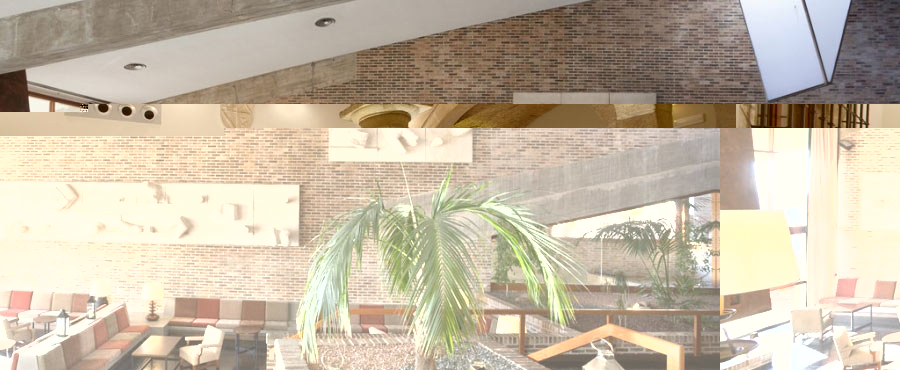 The rooms of the Hotel are large and comfortable, with splendid views over the city, as do the dining room and outdoor pool. The spacious foyer is used to show modern paintings and designs, in clear contrast to the rounded, simple lines framing the heated pool.