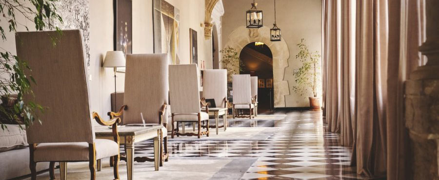 The glazed cloister and old chapel - today a cosy café - are the perfect complement to the interior combining traditional features with more contemporary touches such as wicker, leather and upholstery.