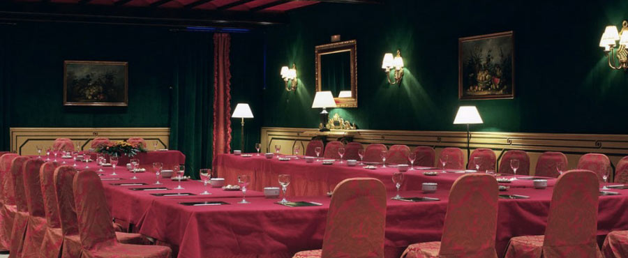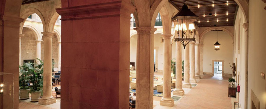 This hotel has a central courtyard surrounded by columned galleries in alternating sections: the first has twenty Tuscan columns with semicircular arches, and the second has twenty Ionic columns.