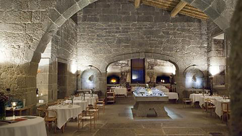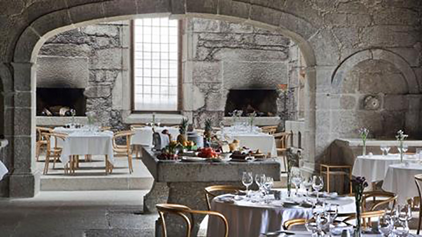 The restaurant area at the Pousada of Santa Maria do Bouro is unique: set in the old kitchen of the Monastery, with the reconstructed original chimney, two impressive ovens and small food heating stoves cut into the stone, it is decorated with a huge granite table that has withstood all looting and bad weather, where the breakfast and dessert buffet is served.